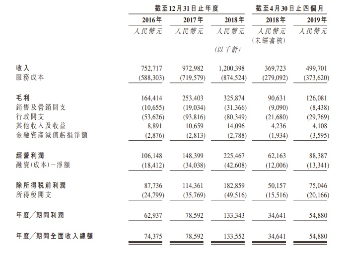 纯利由2016年的人民币 62.9百万元增加至2017年的人民币78.6百万元,并于2018年进一步增加至人民币133.3百万元,复合年增长率为45.6%。公司收入由截至2018年4月30日止四个月的人民币369.7百万元增 加35.2%至截至2019年4月30日止四个月的人民币499.7百万元,而纯利则由截至2018年4月30日止四个月的人民币34.6百万元增加58.4%至截至2019年4月30日止四个月的人民币54.9百万元。