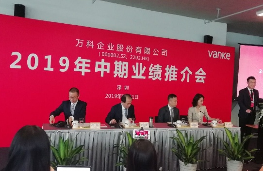 智通财经APP获悉,万科20日晚公布上半年业绩,股东应占溢利118.4亿元(人民币 下同),同比增长29.8%,每股盈利1.06元。期内实现营业收入1,393.2亿元,同比增长31.5%。21日万科在深圳大梅沙总部举行2019年中期业绩推介会,首席执行官祝九胜、首席运营官张旭、财务负责人王文金,董事会秘书朱旭出席。