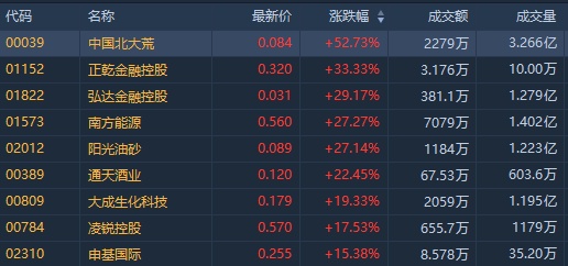 智通财经APP获悉,盘中多支细价股暴涨。截至发稿,中国北大荒(00039)涨47.27%,报0.081港元;正乾金融控股(01152)涨33.33%,报0.32港元;阳光油砂(02012)涨27.14%,报0.089港元;弘达金融控股(01822)涨25%,报0.03港元;通天酒业(00389)涨22.45%,报0.12港元。