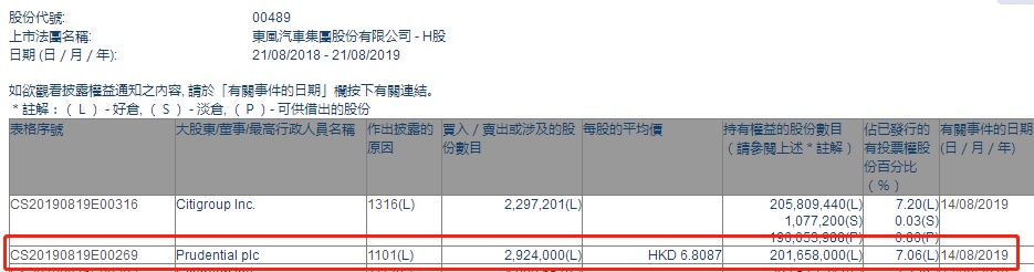 智通财经APP获悉,联交所最新资料显示,8月14日,Prudential plc增持东风集团(00489)292.4万股,每股作价6.8087港元,总金额约为1990.86万港元。增持后最新持股数目约为2.02亿股,最新持股比例为7.06%。