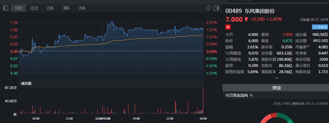 截至今日收盘,东风集团(00489)涨1.46%,报7.00港元。