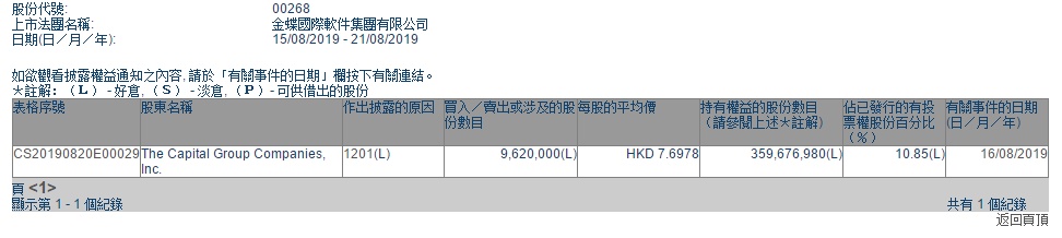 智通财经APP获悉,联交所最新资料显示,8月16日,美国资本集团对金蝶国际(00268)减持962万股,每股平均价7.6978港元,涉及总金额约为7405.3万港元。减持后美国资本集团最新持股数目约为3.6亿股,最新持股比例为10.85%。