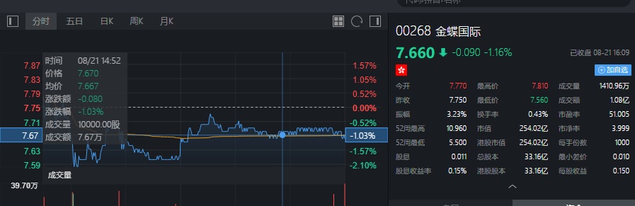 截止今日收盘,金蝶国际跌1.16%,报7.66港元。
