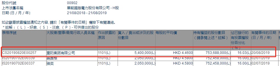 智通财经APP获悉,联交所最新资料显示,8月20日,重阳集团增持华能国际电力(00902)540万股,每股作价4.46港元,总金额为2408.40万港元。增持后最新持股数目约为7.54亿股,最新持股比例为16.03%。