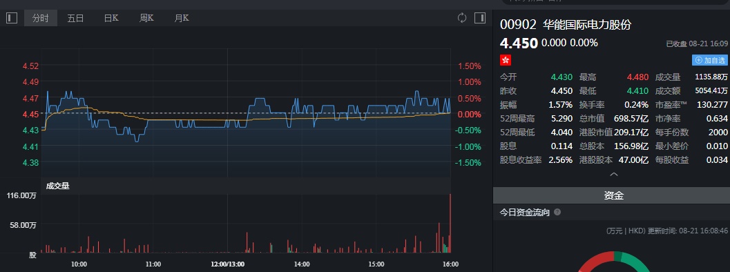 截至今日收盘,华能国际电力(00902)无涨跌,报4.45港元。