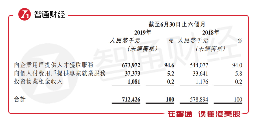 目前该公司收入主要分为向企业用户提供人才获取服务、向个人付费用户提供专业就业服务以及投资物业租金收入,上半年,向企业用户提供人才服务的收入6.74亿元,同比增长23.9%,收入占比94.6%,是该公司的核心业务收入。从往年看,该公司核心业务往年收入占比均超过94%,近三年收入复合增速达41.75%。