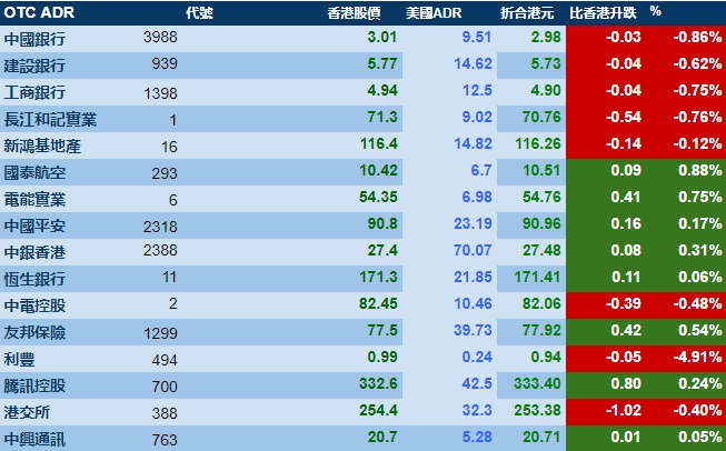 港股ADR指数小幅走低,按比例计算,收报26228点,跌41.79点。大型蓝筹股涨跌互现,汇丰控股收报56.89元,较港收市跌0.31元;腾讯控股收报333.40元,较港收市涨0.80元。