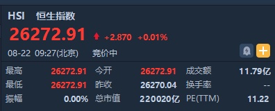 智通财经APP获悉,恒生指数开盘涨2.87点或0.01%,报26272.91点。国企指数跌0.13%,报10163.94点。红筹指数涨0.26%,报4236.91点。大市盘前成交11.79亿港元。