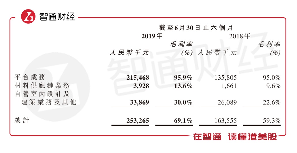 2019年上半年,公司三大持续经营业务毛利、毛利率均较去年同期有进一步提升。其中,公司毛利提升54.85%至2.53亿元,整体毛利率较去年同期提升9.8个百分点至69.1%;平台业务、材料供应链业务、自营室内设计装修及其他业务毛利分别同比提升58.66%、136.48%、29.82%。