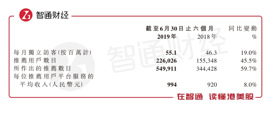 据公司董事会主席兼CEO邓华金表示,公司平台业务的核心驱动力主要由两部分组成:1.推荐用户数量增长;2.每推荐用户数客单价提升。2019年中期,公司推荐用户数较去年同期增长了45.5%,每推荐用户客单价也有8.0%的提升,“量”“价”上升共同促进了该板块在上半年的增长。