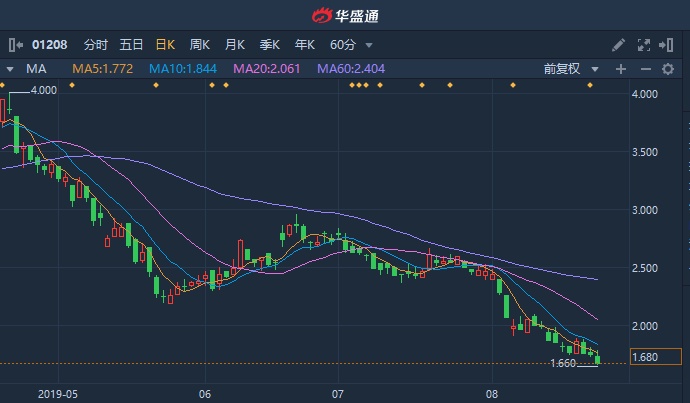 智通财经APP获悉,五矿资源(01208)公布2019年上半年业绩,该公司收入为13.87亿美元,同比降27%;公司权益持有人应占除税后亏损8100万美元,而去年同期公司权益持有人应占除税后盈利为1.29亿美元。截至发稿,跌5.11%,报1.67港元,成交额2990.57万港元,股价创近三年新低。