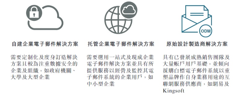 关于发展计划,公司表示将进一步巩固作为中国领先企业电子邮件解决方案供应商的地位,计划成立更多分公司,扩充销售以及分销网络,并计划将业务扩充至海外市场,并就海外市场开发产品,加强产品及服务的安保功能及特色,并进一步加强电子邮件解决方案对国产软件和硬件的适配程度。