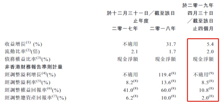主要财务比率方面,截至2019年4月30日止四个月,公司收益增长5.4%,流动比率为2.0;非香港财务准则下,经调整溢权益回报率为10.8%,经调整总资产回报率为2.0%。