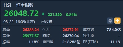 智通财经APP获悉,恒生指数开盘涨2.87点或0.01%,报26272.91点。截至收盘,恒生指数跌221.32点或0.84%,报26048.72点,全日成交额达784.05亿。国企指数跌0.53%,报10122.9点,红筹指数跌0.73%,报4194.95点。