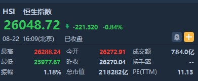 智通财经APP获悉,恒生指数早盘微涨0.01%,盘初现一轮跳水,随后全天震荡下行。截至收盘,恒生指数跌221.32点或0.84%,报26048.72点,全日成交额达784.05亿。国企指数跌0.53%,报10122.9点,红筹指数跌0.73%,报4194.95点。