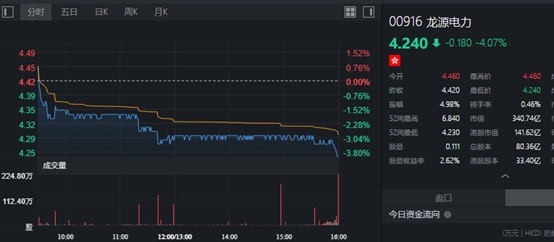 截至今日,龙源电力(00916)跌4.07%,报4.24港币。