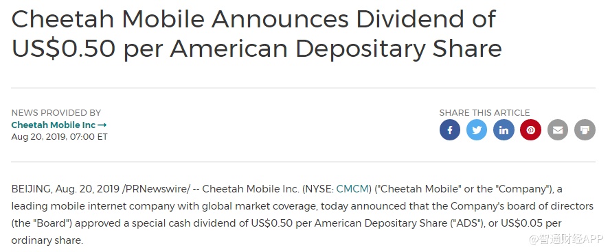 截至8月20日收盘,猎豹市值6.43亿美元,没有大涨前市值约4.7亿美元。公司一共1.43亿股ADS,相当于派息7150万美元股息。没大涨前的股息率约15%,即使在昨晚大涨后,股息率依然有11%。这么高的股息率,无论在哪个市场都非常有吸引力。并且股息将以现金形式在2019年9月30日发放。对此,公司CEO傅盛解释本次特别股息是对投资者的回馈,也彰显对公司商业模式的信心。