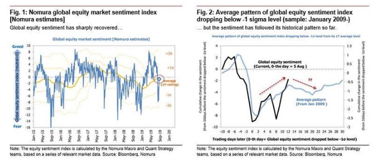 但目前的股市反弹似乎主要是由一厢情愿的想法推动的,尤其是第二点,投资者应该保持警惕,直到美联储主席杰罗姆·鲍威尔(Jerome Powell)在杰克逊霍尔会议的演讲中明确表示美联储的鸽派立场。目前全球股市情绪的复苏仍在2009年以来观察到的自然反弹的平均范围内(情绪下降一个标准差后的平均轨迹)。简单地将这种平均模式应用于当前的情绪趋势,表明投资者情绪可能会从8月26日左右再次下降。