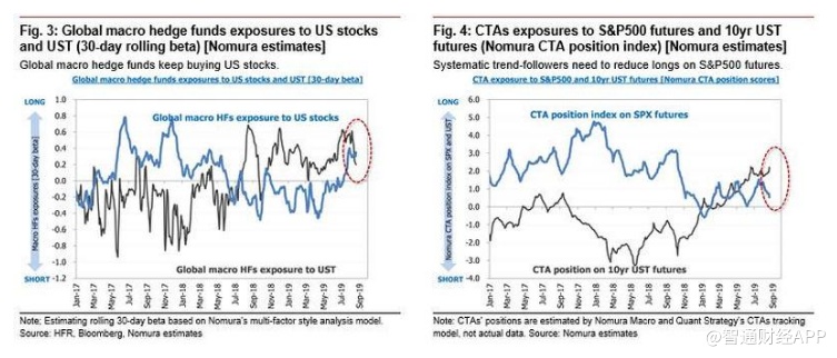 对冲基金的投资行为各不相同。(1)对基本面看涨的全球宏观对冲基金仍在逢低买入,而(2)趋势跟踪算法的参与者(CTAs基金和风险平价基金)仍处于观望状态,但如果恐慌指数(VIX)再次上扬,可能不得不平仓。当标准普尔500指数低于2960点时,CTAs仍在通过结束多头来探寻市场。CTAs目前只有60%的标普500多头期货仓位在最近的峰值(7月16日)被解除。我们认为2920点-2960点是反弹卖出(sell the rally)的区域。如果全球宏观对冲基金对杰克逊霍尔会议和鲍威尔的讲话结果感到失望,那么标准普尔500指数可能无法突破2960点,这可能导致CTAs推迟向股票购买转变。