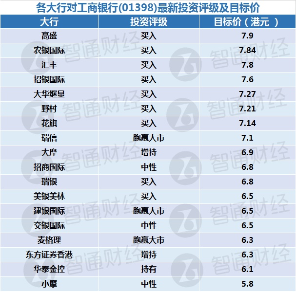 六:各大行对工商银行(01398)最新投资评级及目标价: