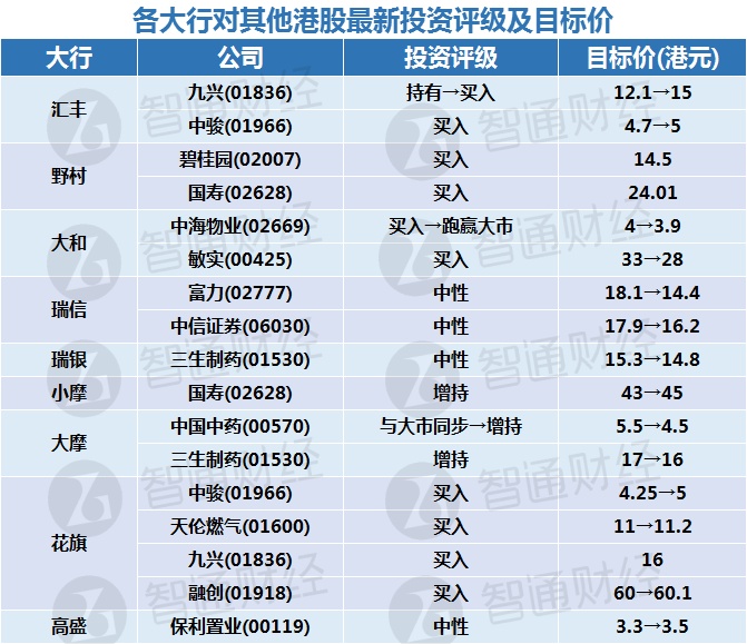 八:各大行对其他港股最新投资评级及目标价: