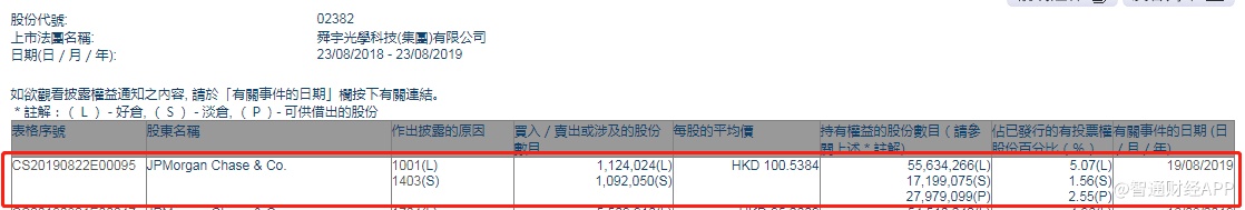 智通财经APP获悉,联交所最新资料显示,8月19日,小摩增持舜宇光学(02382)约112.4万股,每股作价100.5384港元,总金额约为1.13亿港元,增持后最新持股数目约为5563万股,最新持股比例为5.07%。