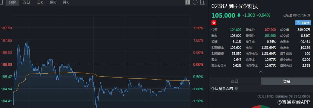 截至今日收盘,舜宇光学(02382)跌0.94%,报105港元。