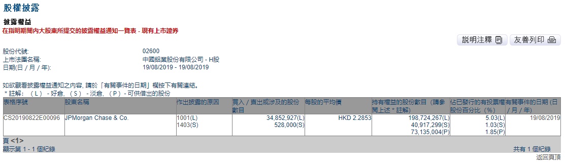 智通财经APP获悉,联交所最新资料显示,8月19日中国铝业(02600)获小摩增持3485.29万股,每股作价2.2853港元,总值约为7965万港元,最新持股数目约为1.99亿股,最新持股比例为5.03%。