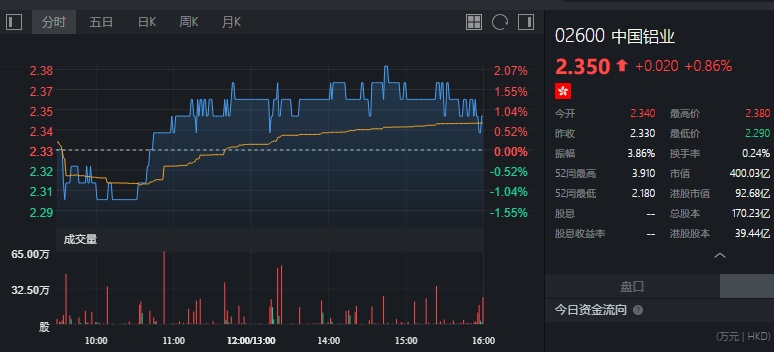 截至今日,中国铝业(02600)涨0.86%,报2.35港币。