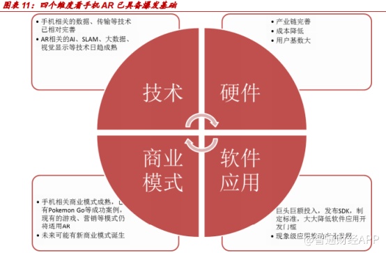 当然,AR技术的输出与最终变现还离不开应用载体。得益于近10年来全球智能手机的高度发展,如今的AR技术已拥有一个系统高度集成的成熟硬件载体;软件方面,IOS、安卓平台增强现实SDK的发布,则让AR内容平台搭建逐步趋于完善。