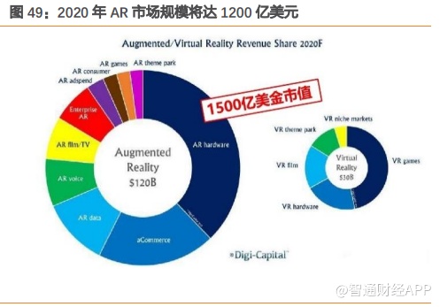 从市场规模角度看,Digi-Capital统计数据显示,2018年AR/VR市场出现大幅增长,预计两产业整体市场规模在2020年达到1500亿美元。其中AR市场规模将达到1200亿美元,预计达到VR市场规模的4倍。