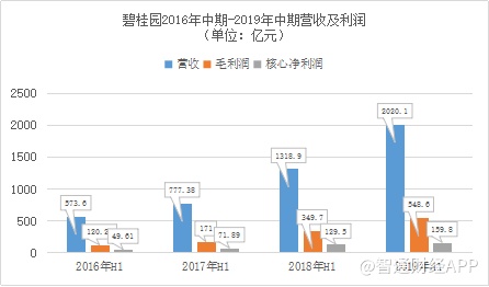 2018年下半年,公司提出了“提质控速”发展的口号,房企大象碧桂园,也开始在策略上进行转变以适应新发展时代。自口号提出一年之后,公司正式交上了新的成绩单。2019上半年,公司总收入2020.1亿元,净利润230.6亿元,分别同比增长53.2%和41.3%。股东应占净利润约为156.4亿元,同比增长20.8%;股东应占核心净利润同比增长23.4%至159.8亿元。