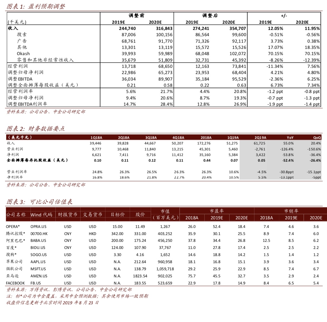 增量投资为未来发展提供资金。营销和分销费用同比增长169%至2110万美元,人员费用同比增长67%至1560万美元,主要由于欧朋增长计划相关投资和人员增加。我们认为公司2019年净利润面临短期压力,主要因为公司加大了能推动长期增速的投资。随着OList 和其他新项目逐渐扩张并开始变现,我们认为2020年起净利润将回升。