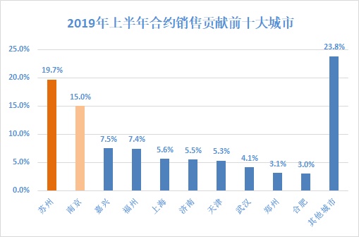 从销售区域及城市细分来看,上半年合约销售金额贡献前五大城市均位于长三角地区,该区域整体合约销售占比达55.7%,如苏州、南京两大城市分别占合约总销售的19.7%、15%。