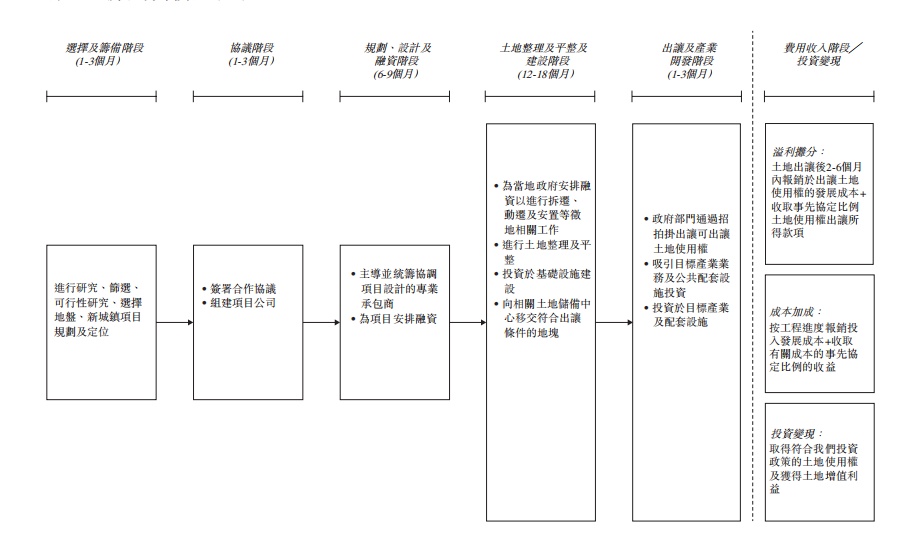 下图说明万新集团的业务模式及与当地政府订立的典型合作协议下涉及项目特定阶段的典型新城镇发展流程。