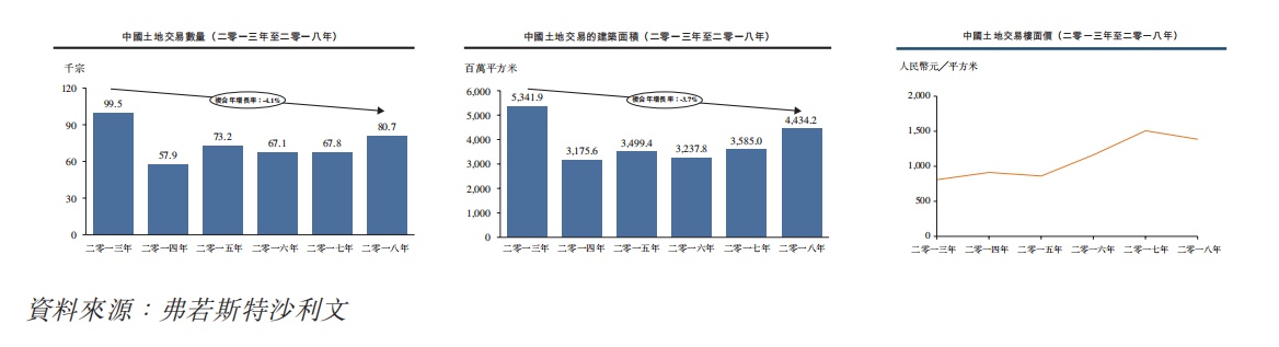 土地交易宗数从2013年的99,500宗减少至2018年的80,700宗。土地交易的建筑面积由2013年的5,341.9百万平方米减少至2018年的4,434.2百万平方米。该减少主要是由于土地供应减少及土地市场交易放缓,主要因对土地竞标愈趋严格的规定及为物业开发商筹集资金愈趋困难所致。近两年来,由于住宅及工业用地土地使用权交易的数目增加,土地交易出现复苏。