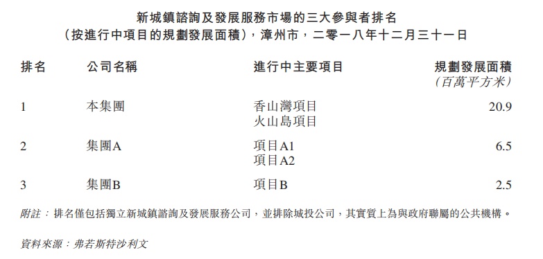 于漳州,于2018年12月31日,按进行中项目的规划发展面积计,万新集团为最大的独立新城镇咨询及发展服务提供商。香山湾项目及火山岛项目的总规划面积为20.2百万平方米。紧随本公司后,按进行中新城镇发展项目的规划发展面积计,集团A及集团B分别于漳州市场排名第二及第三。