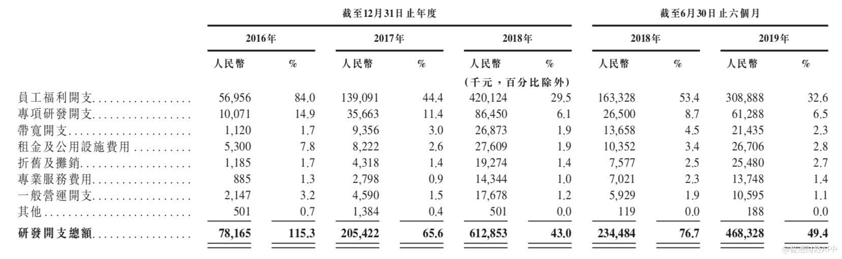 招股书显示,研发开支由截至2018年6月30日止六个月人民币2.345亿元增加99.7%至截至2019年6月30日止六个月人民币4.683亿元,主要是由于员工福利开支增加。员工福利开支由截至2018年6月30日止六个月人民币1.633亿元增至截至2019年6月30日止六个月人民币3.089亿元,是由于研发人员数由2018年6月30日的763名增至2019年6月30日的1432名。