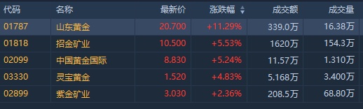 截至发稿,山东黄金(01787)涨11.29%,报20.7港元;中国黄金国际(02099)涨5.24%,报8.83港元;灵宝黄金(03330)涨4.83%,报1.52港元;招金矿业(01818)涨5.53%,报10.5港元;紫金矿业(02899)涨2.36%,报3.03港元。