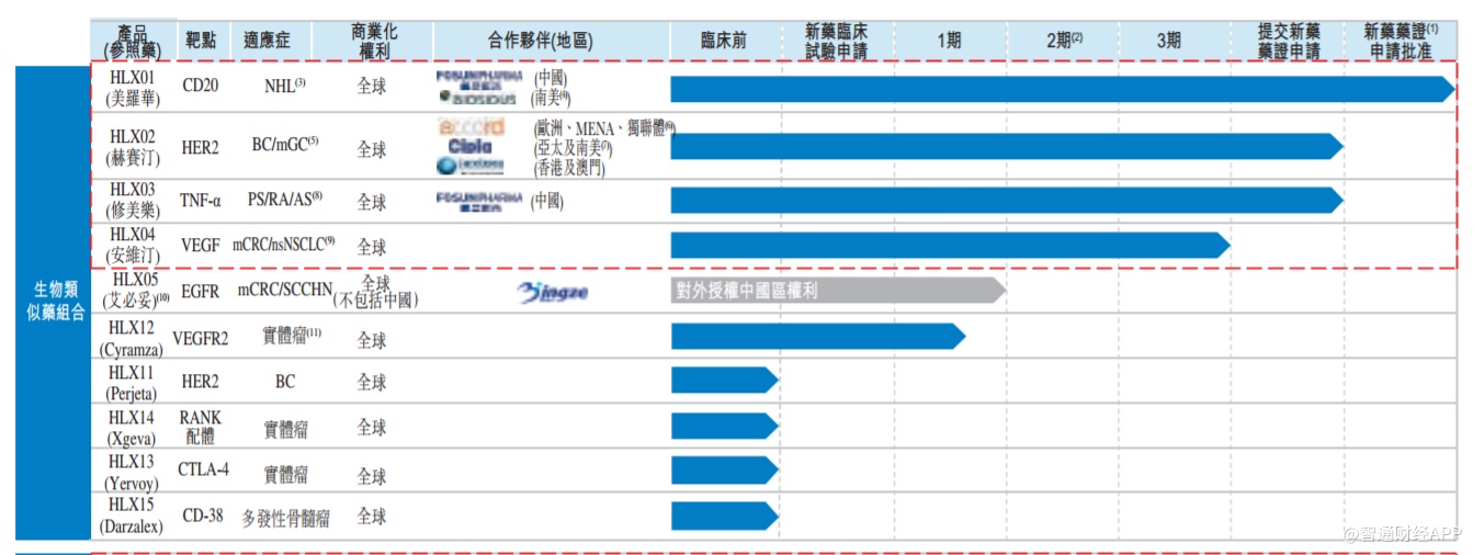 自2010年成立以来,该公司已建立且持续拓展全面的生物类似药及生物创新药产品管线。于最后实际可行日期,除已商业化推出的生物类似药产品(即HLX01汉利康)外,其在管线中自主开发20种以上候选生物药及多种肿瘤免疫联合疗法,其中(i)2种候选单抗获国家药监局接纳新药药证申请,包括1种候选单抗获欧洲药品管理局接纳营销授权申请,(ii)2种候选单抗正在进行3期临床试验及6种候选单抗正在进行1/2期临床试验,以及两种正在进行3期临床试验的肿瘤免疫联合疗法及(iii)已在不同司法权区取得30项新药临床试验申请批准。