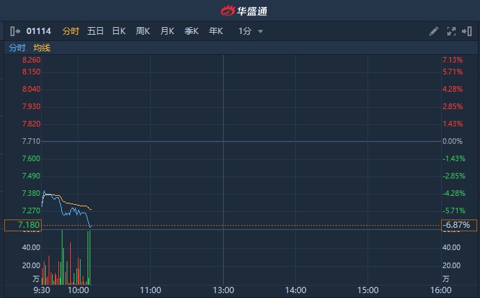 智通财经APP获悉,华晨中国(01114)上周五发布财报,上半年净利同比降9.42%至32.3亿元。截至发稿,跌6.87%,报7.18港元,成交额4590.83万港元。
