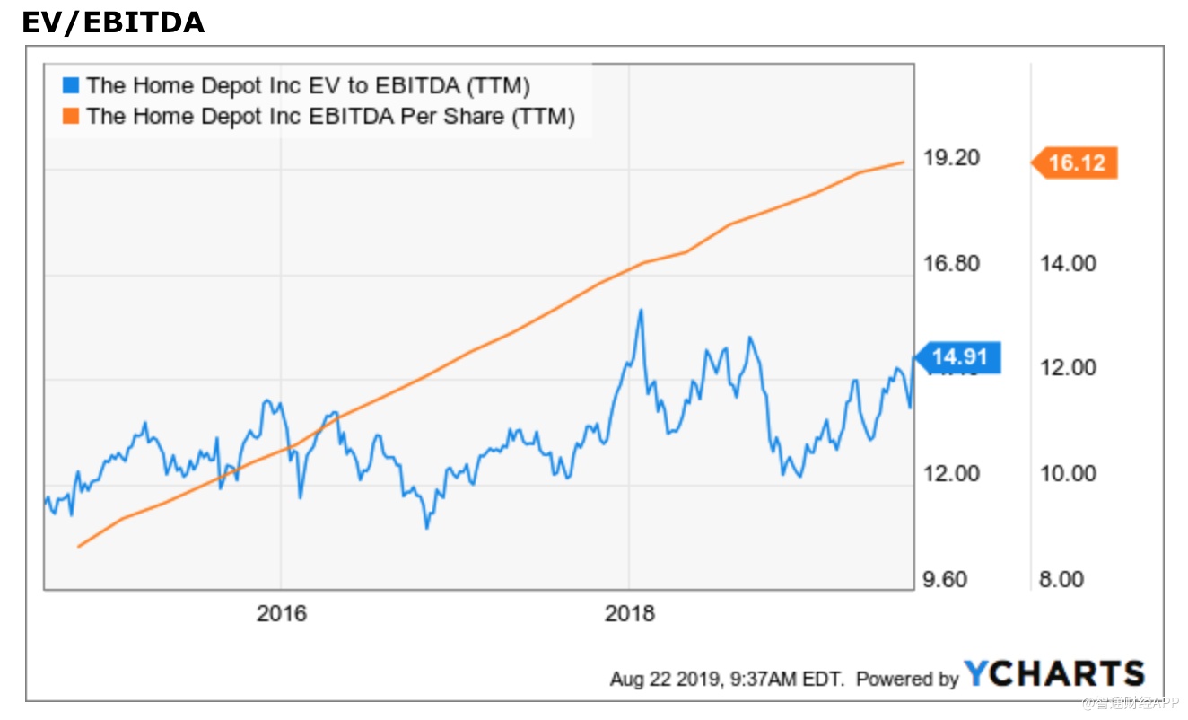 在市盈率和EV/EBITDA的基础上,过去五年家得宝的盈利持续增长,且市盈率和EV/EBITDA在过去五年中一直处于合理稳定的趋势中。