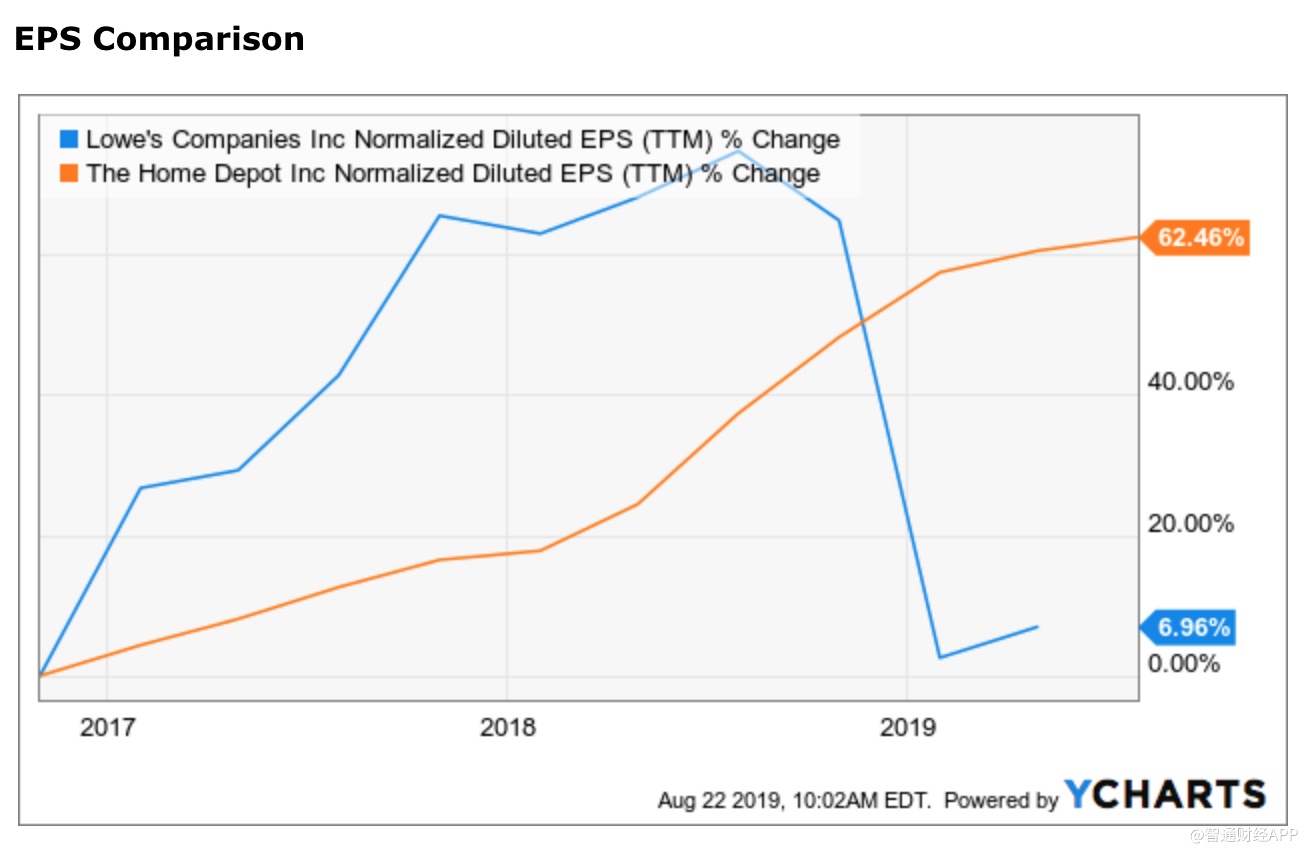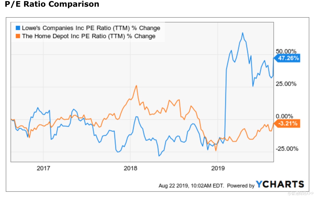 此外,当比较家得宝和其竞争对手Lowe's在过去三年的市盈率和每股盈利(EPS)增长,可以发现Lowe's的市盈率增长远快于家得宝,而家得宝的EPS增长速度超过了Lowe’s: