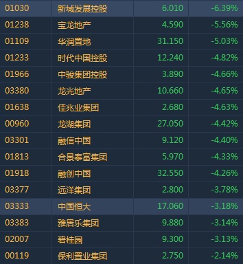 智通财经APP获悉,受行业政策影响,港股内房股全线走弱,截至10时41分,新城发展控股(01030)跌6.39%,报价6.01港元,宝龙地产(01238)跌5.56%,华润置地(01109)跌5.03%,时代中国(01233)跌4.82%,中骏集团(01966)跌4.66%。