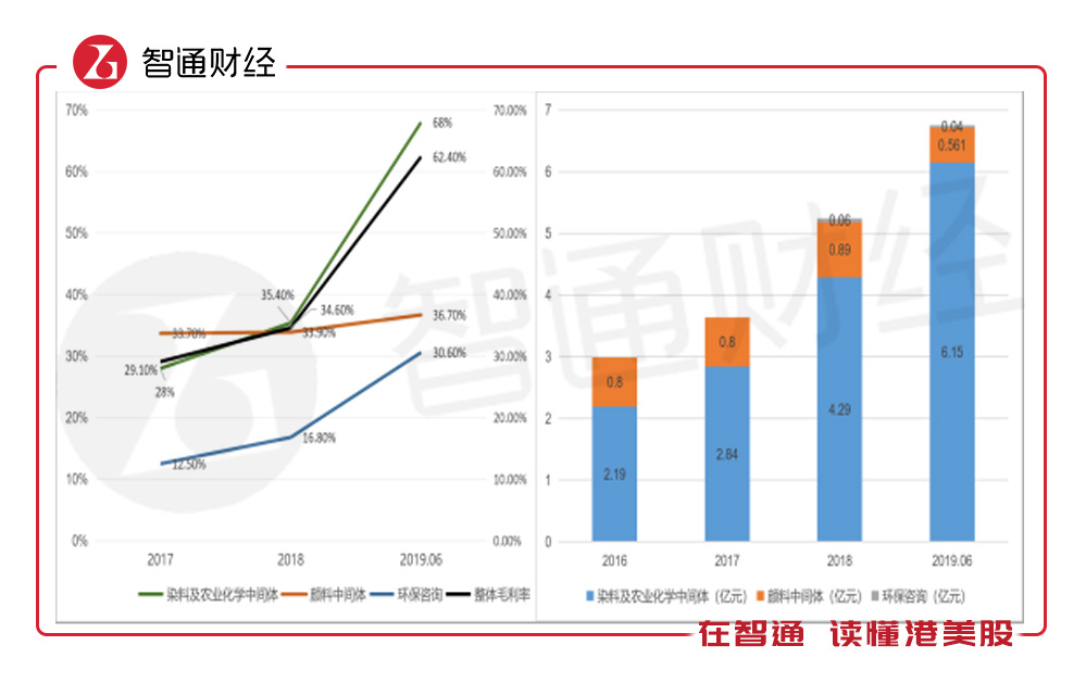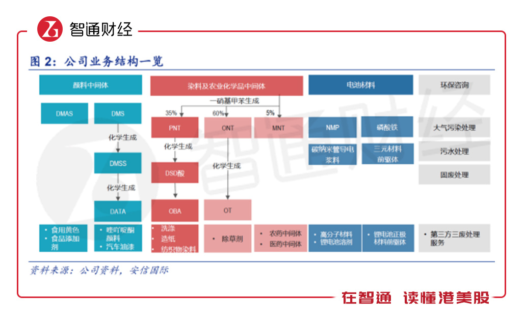 该公司目前有四大业务,分别是染料及农业化学品中间体、颜料中间体、环保咨询及电池材料业务,其中染料中间体和农化学品中间体为2018年调整分录合并,而提供的产品包括 DSD 酸、DMSS、DMAS及ONT/OT 等。从行业地位看,该公司是全球最大的DSD酸和DMSS生产商、全球第二大的DMAS生产商和全球第三大的一硝基甲苯生产商。