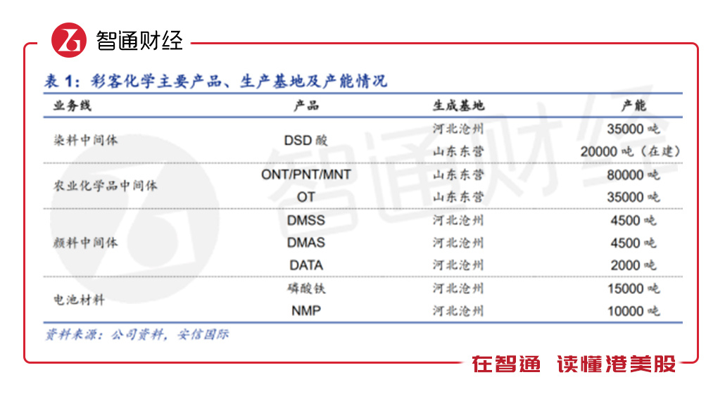 智通财经APP了解到,彩客化学是全球领先的精细化学品生产商。从历史上看,该公司成立于1997年,最初从事生产及销售 DSD 酸,2001年介入颜料中间体业务,2016年向夏津县振华化学租赁了OBA资产,进入 DSD 酸下游,2017年开始介入动力电池正极材料前驱体市场。