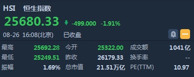 智通财经APP获悉,恒指早盘低开857.33点或3.27%,报25322点。尾盘跌幅持续收窄,截至收盘,恒生指数跌4.99点或1.91%,报25680.33点,全日成交额达1041.91亿。国企指数跌1.78%,报10013.51点,红筹指数跌2.44%,报4107.12点。