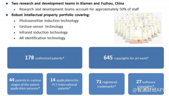 智通财经APP了解到,经过10年的积累,目前公司的知识产权组合已包括178项授权专利,44项处于申请中的专利、14项PCT国际专利、71个注册商标、645个艺术品版权以及27个软件版权。公司获得专利数在国内玩具行业中大幅领先。