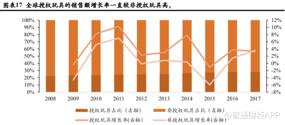 据Euromonitor统计,在全球市场中,2009-2017年IP授权玩具的销售额增长率一直高于玩具整体的销售额增长率,是全球玩具销售额增长的核心动力。授权玩具销售额占比从2008年的22.72%上升至 2017年的28.17%,2008-2017年复合增长4.05%,高于非授权玩具0.77%的年复合增长率。