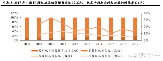 Euromonitor统计数据显示,中国IP授权玩具销售额占比从2008年9.01%攀升至 2017年的17.81%;2017年国内IP授权玩具销售额增长率达12.22%,远高于同期非授权玩具的增长率6.41%。由此可见,近年来国内玩具IP授权环境正在逐步好转。